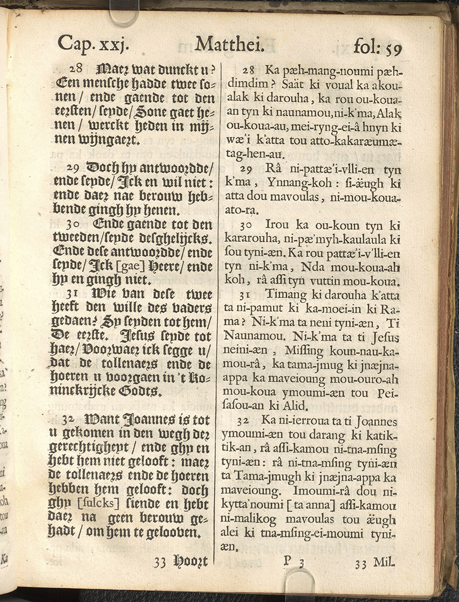 1661年新港譯本馬太福音和約翰福音(丹麥皇家圖書館) 馬太福音 21 章 28 節到 21 章 32 節