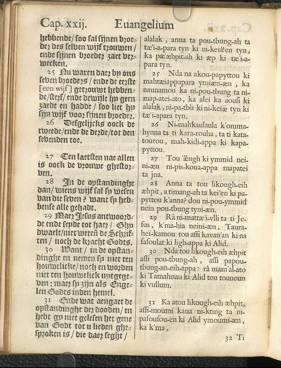 1661年新港譯本馬太福音和約翰福音(丹麥皇家圖書館) 馬太福音 22 章 25 節到 22 章 31 節