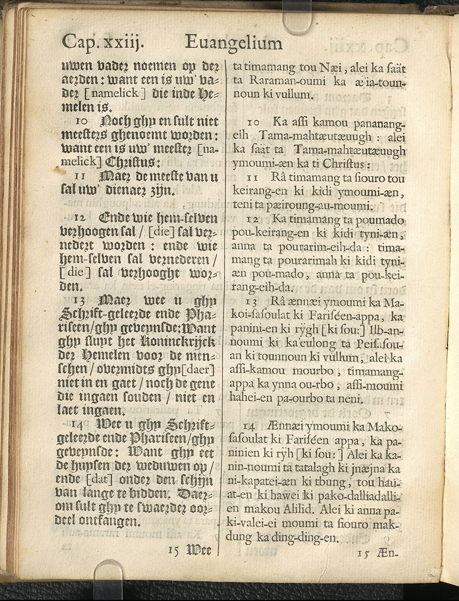 1661年新港譯本馬太福音和約翰福音(丹麥皇家圖書館) 馬太福音 23 章 10 節到 23 章 14 節