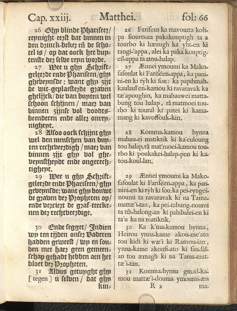 1661年新港譯本馬太福音和約翰福音(丹麥皇家圖書館) 馬太福音 23 章 26 節到 23 章 31 節