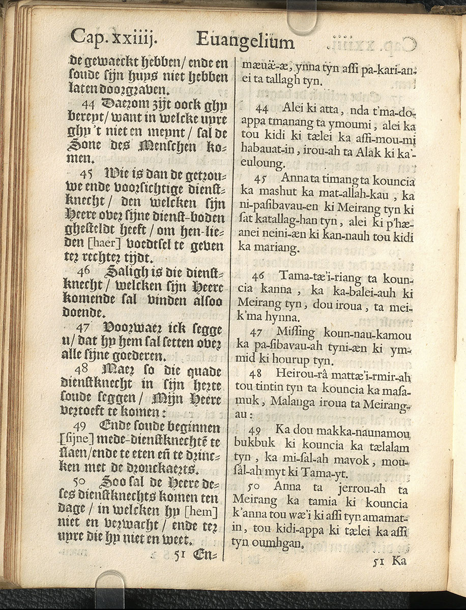 1661年新港譯本馬太福音和約翰福音(丹麥皇家圖書館) 馬太福音 24 章 44 節到 24 章 50 節