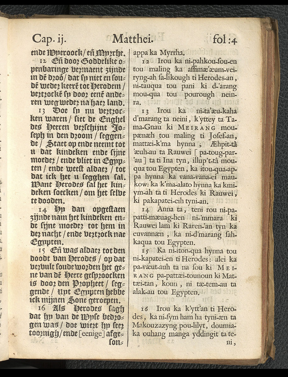 1661年新港譯本馬太福音和約翰福音(丹麥皇家圖書館) 馬太福音 2 章 12 節到 2 章 16 節