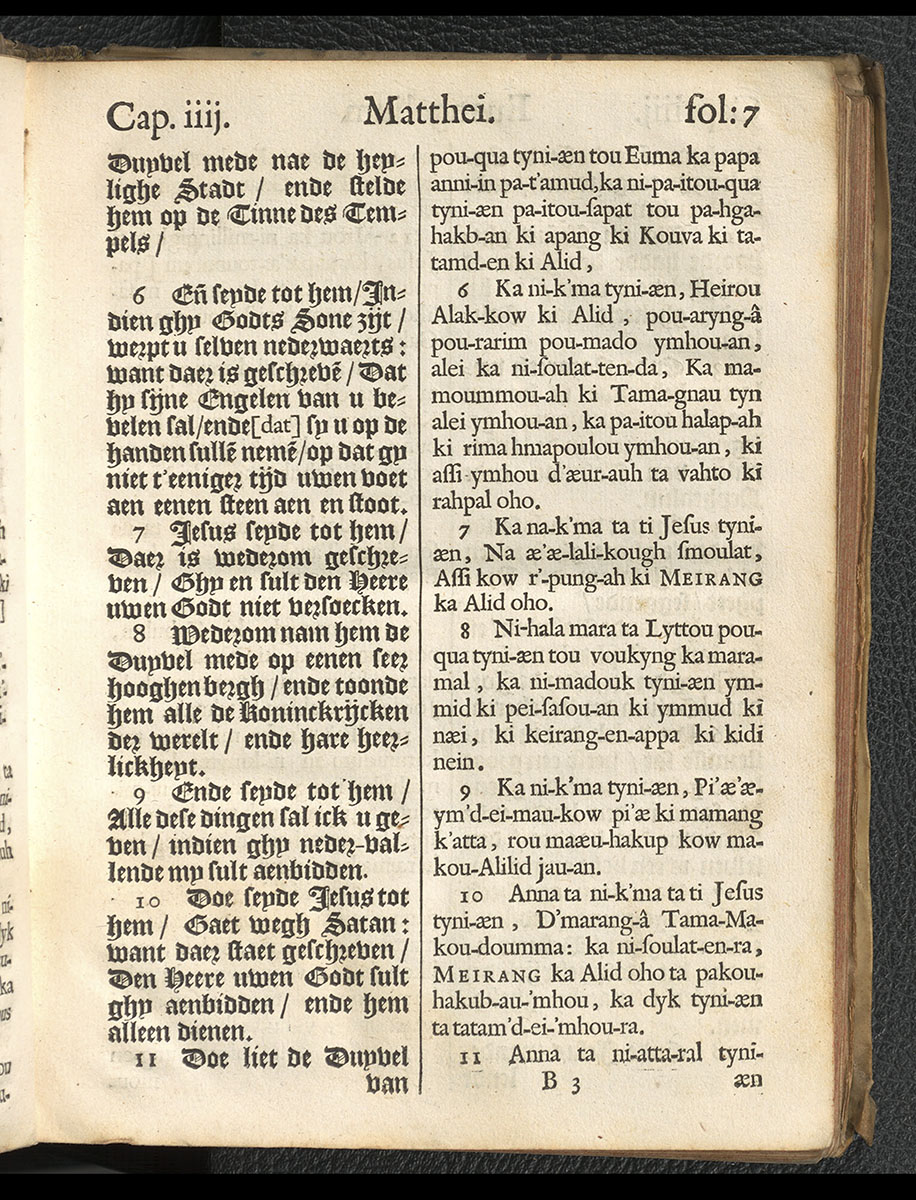 1661年新港譯本馬太福音和約翰福音(丹麥皇家圖書館) 馬太福音 4 章 6 節到 4 章 11 節