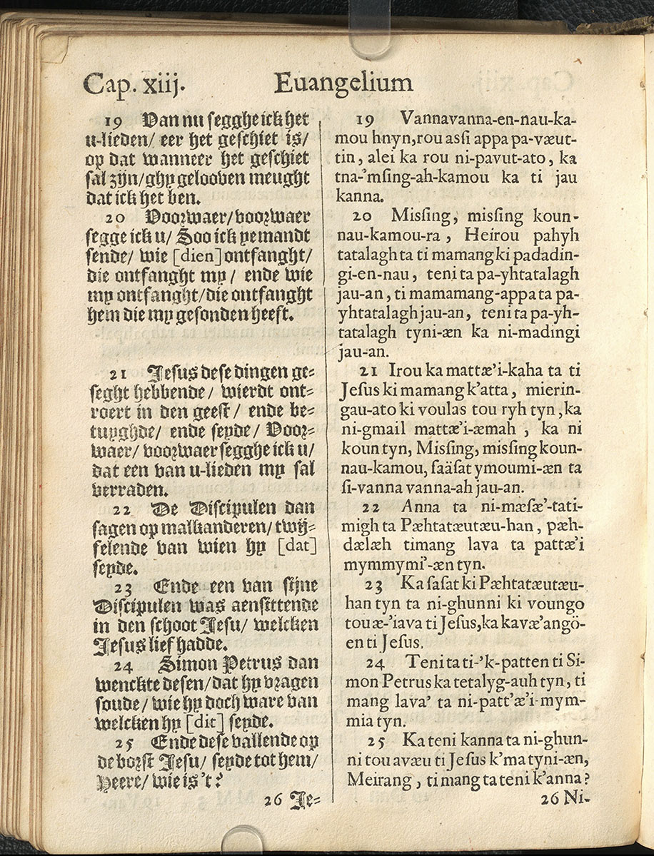 1661年新港譯本馬太福音和約翰福音(丹麥皇家圖書館) 約翰福音 13 章 19 節到 13 章 25 節