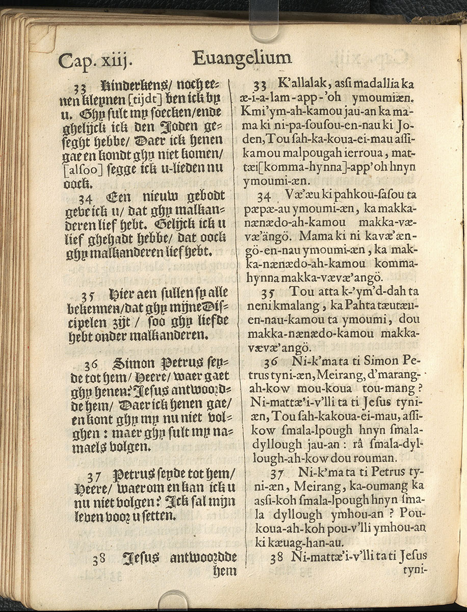 1661年新港譯本馬太福音和約翰福音(丹麥皇家圖書館) 約翰福音 13 章 33 節到 13 章 37 節