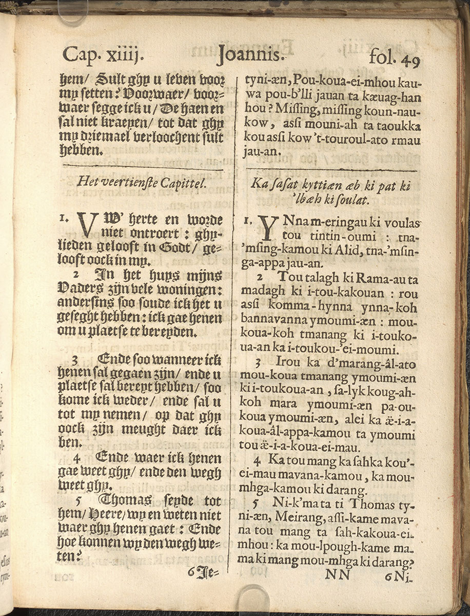 1661年新港譯本馬太福音和約翰福音(丹麥皇家圖書館) 約翰福音 14 章 1 節到 14 章 5 節