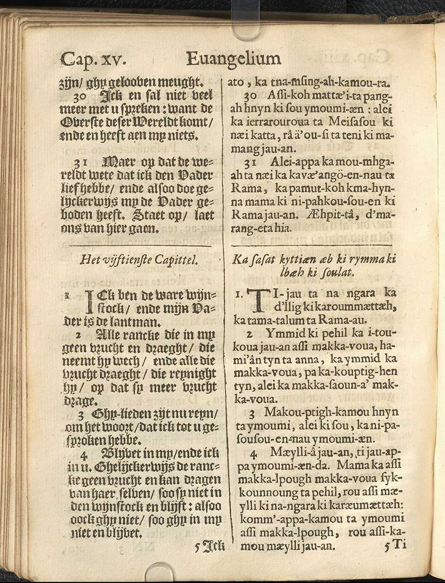 1661年新港譯本馬太福音和約翰福音(丹麥皇家圖書館) 約翰福音 14 章 30 節到 15 章 4 節