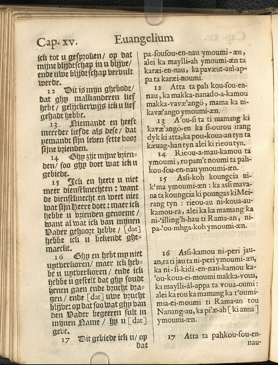 1661年新港譯本馬太福音和約翰福音(丹麥皇家圖書館) 約翰福音 15 章 12 節到 15 章 17 節