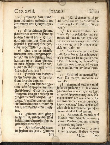1661年新港譯本馬太福音和約翰福音(丹麥皇家圖書館) 約翰福音 18 章 24 節到 18 章 30 節