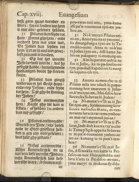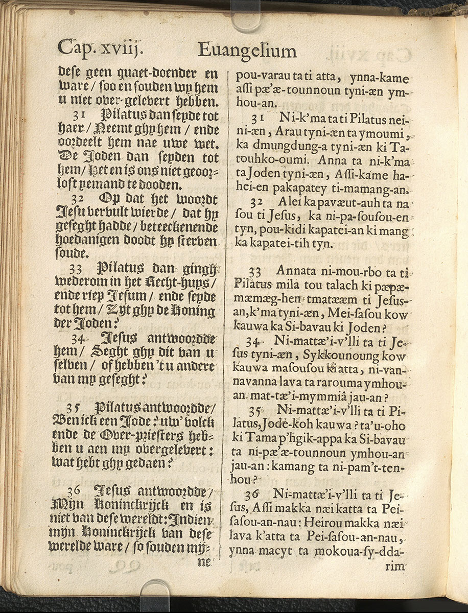 1661年新港譯本馬太福音和約翰福音(丹麥皇家圖書館) 約翰福音 18 章 31 節到 18 章 36 節