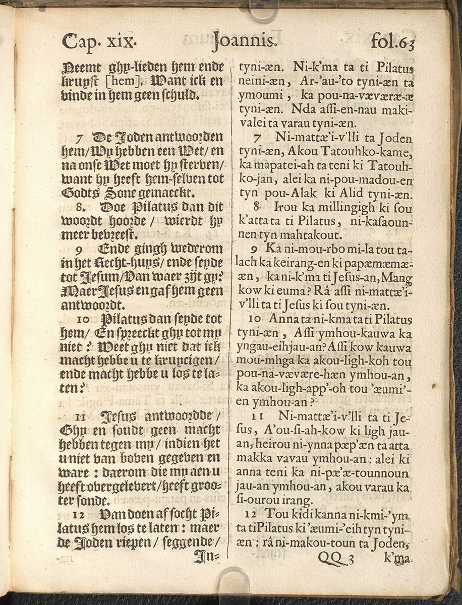 1661年新港譯本馬太福音和約翰福音(丹麥皇家圖書館) 約翰福音 19 章 7 節到 19 章 12 節