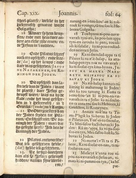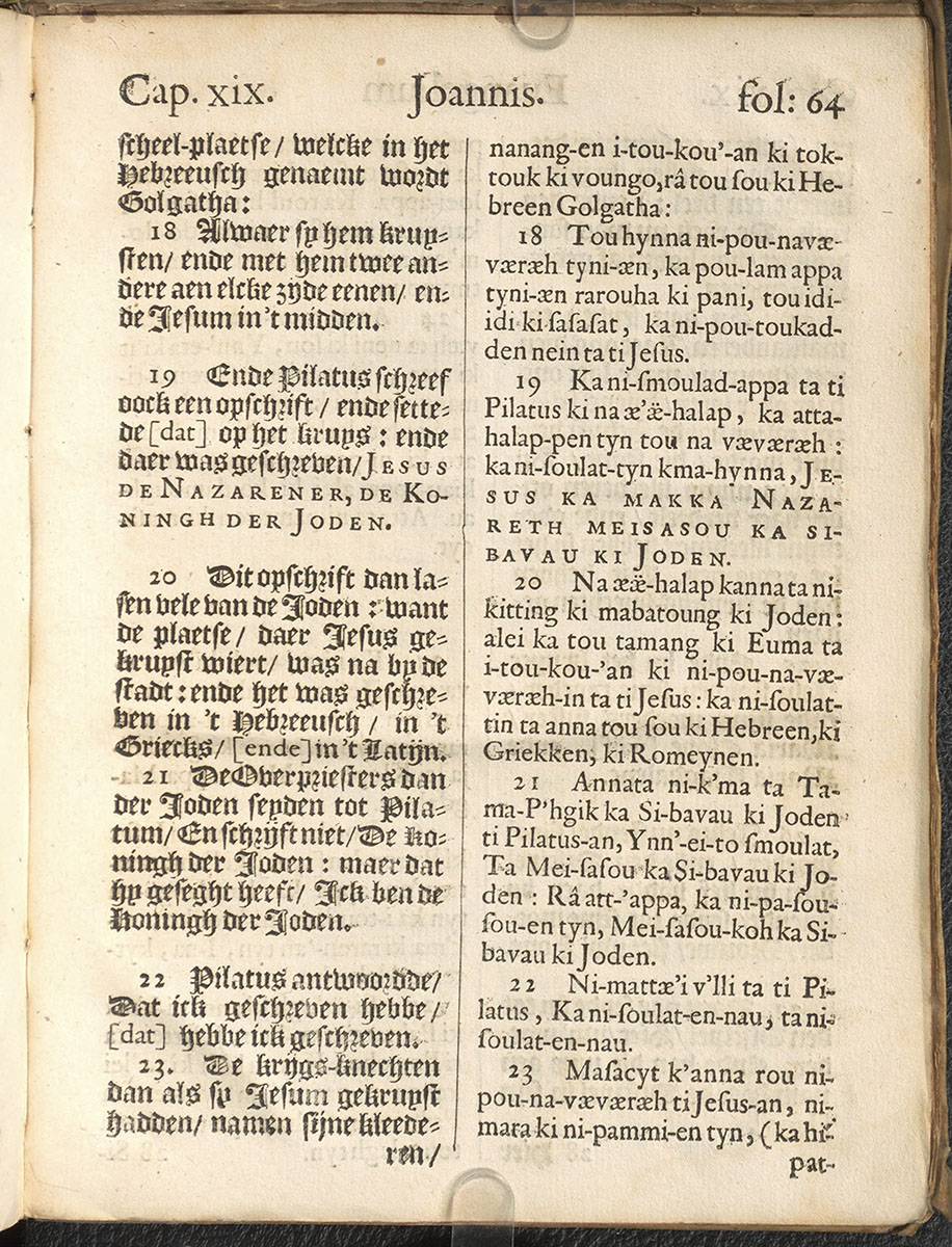 1661年新港譯本馬太福音和約翰福音(丹麥皇家圖書館) 約翰福音 19 章 18 節到 19 章 23 節
