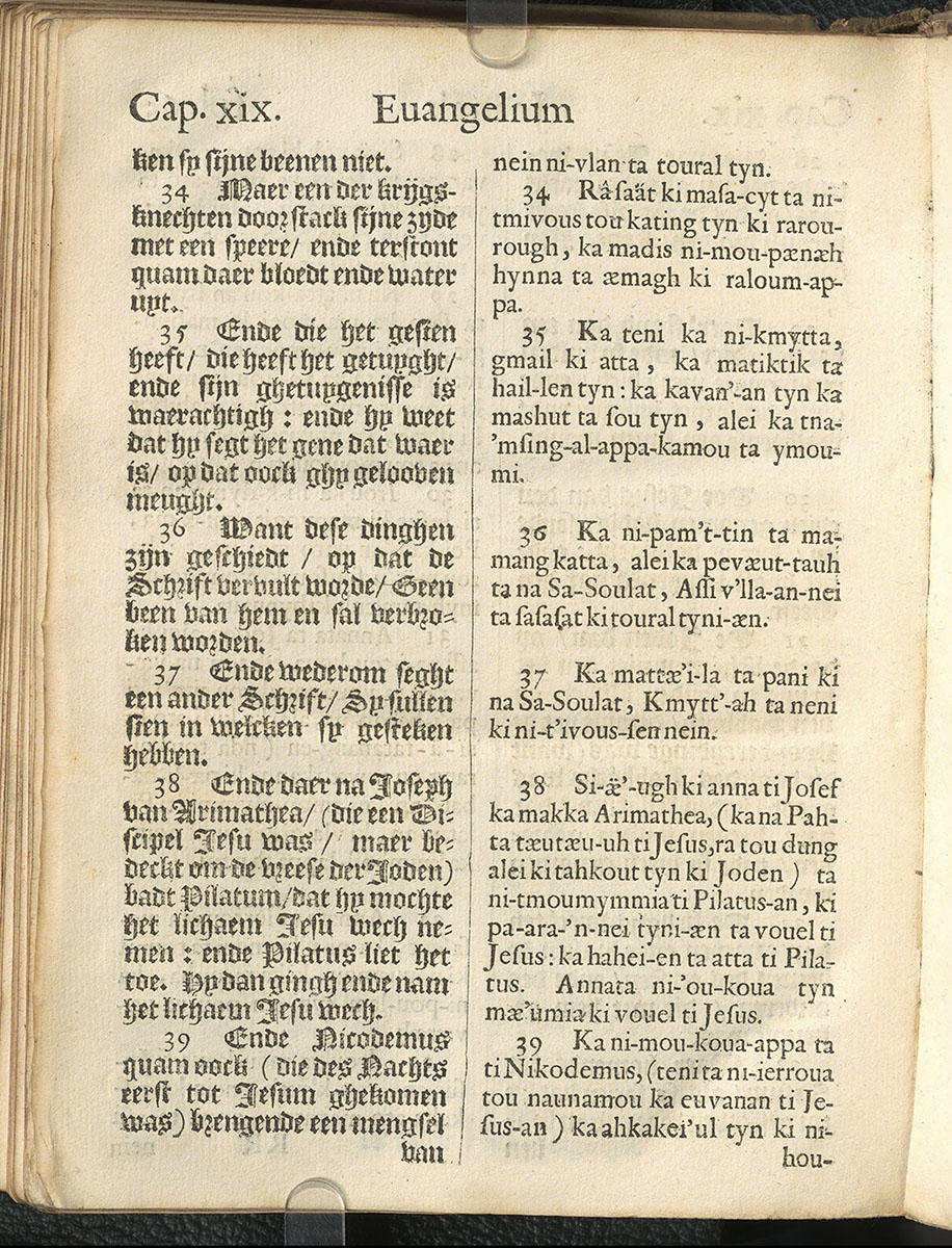 1661年新港譯本馬太福音和約翰福音(丹麥皇家圖書館) 約翰福音 19 章 34 節到 19 章 39 節