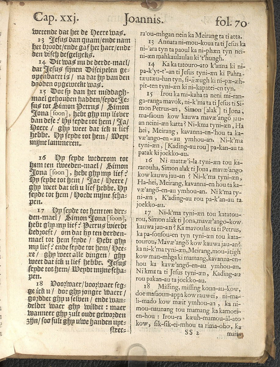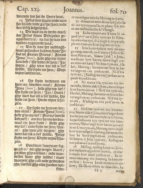 1661年新港譯本馬太福音和約翰福音(丹麥皇家圖書館) 約翰福音 21 章 13 節到 21 章 18 節