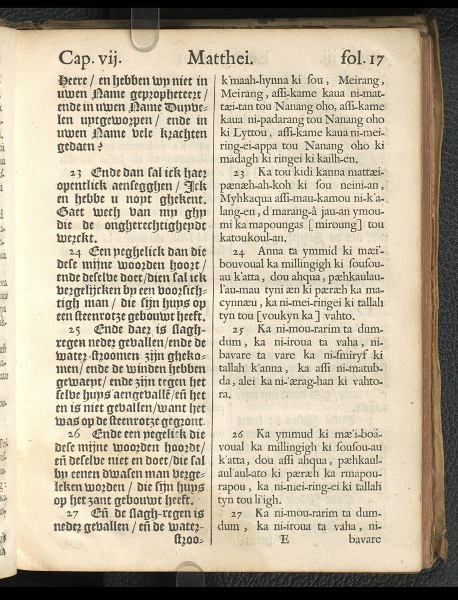 1661年新港譯本馬太福音和約翰福音(丹麥皇家圖書館) 馬太福音 7 章 23 節到 7 章 27 節