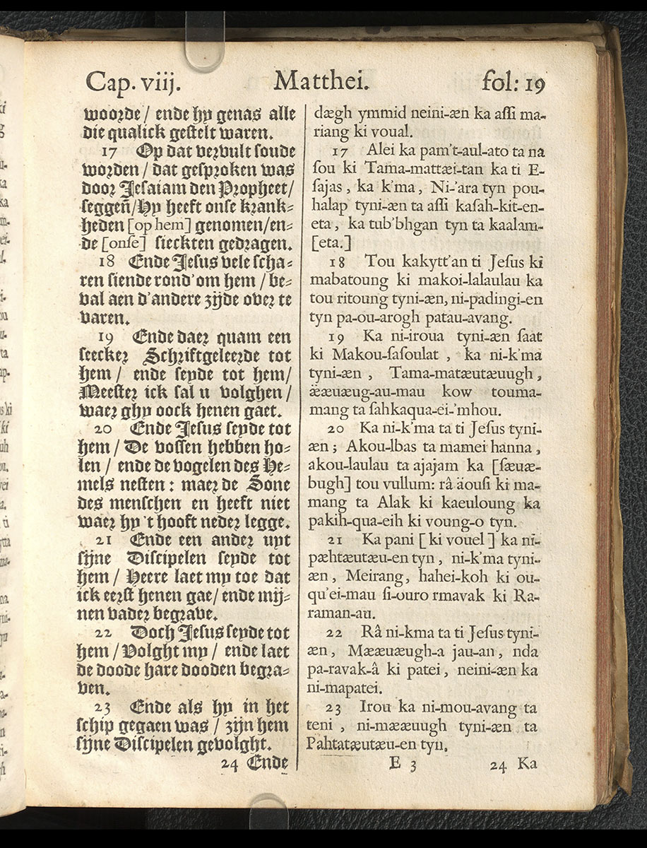 1661年新港譯本馬太福音和約翰福音(丹麥皇家圖書館) 馬太福音 8 章 17 節到 8 章 23 節