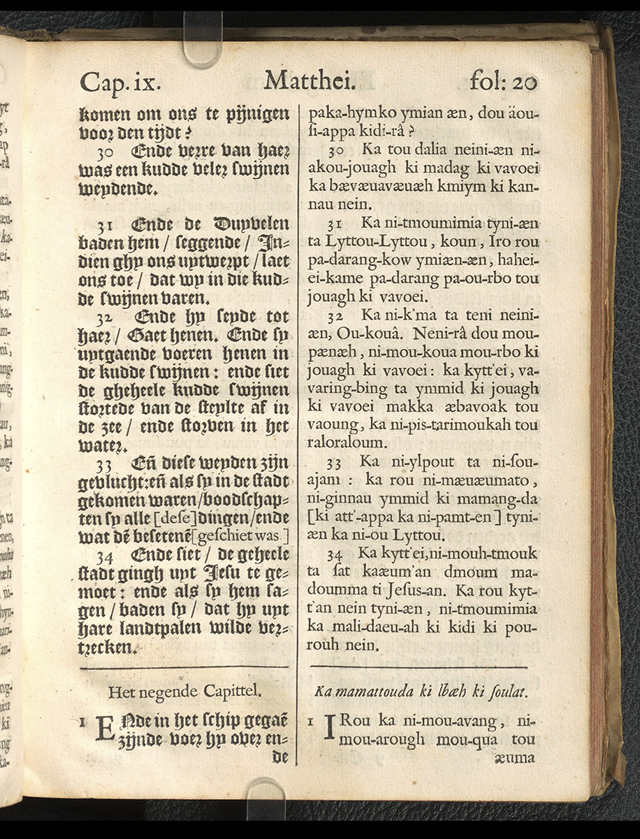 1661年新港譯本馬太福音和約翰福音(丹麥皇家圖書館) 馬太福音 8 章 30 節到 9 章 1 節