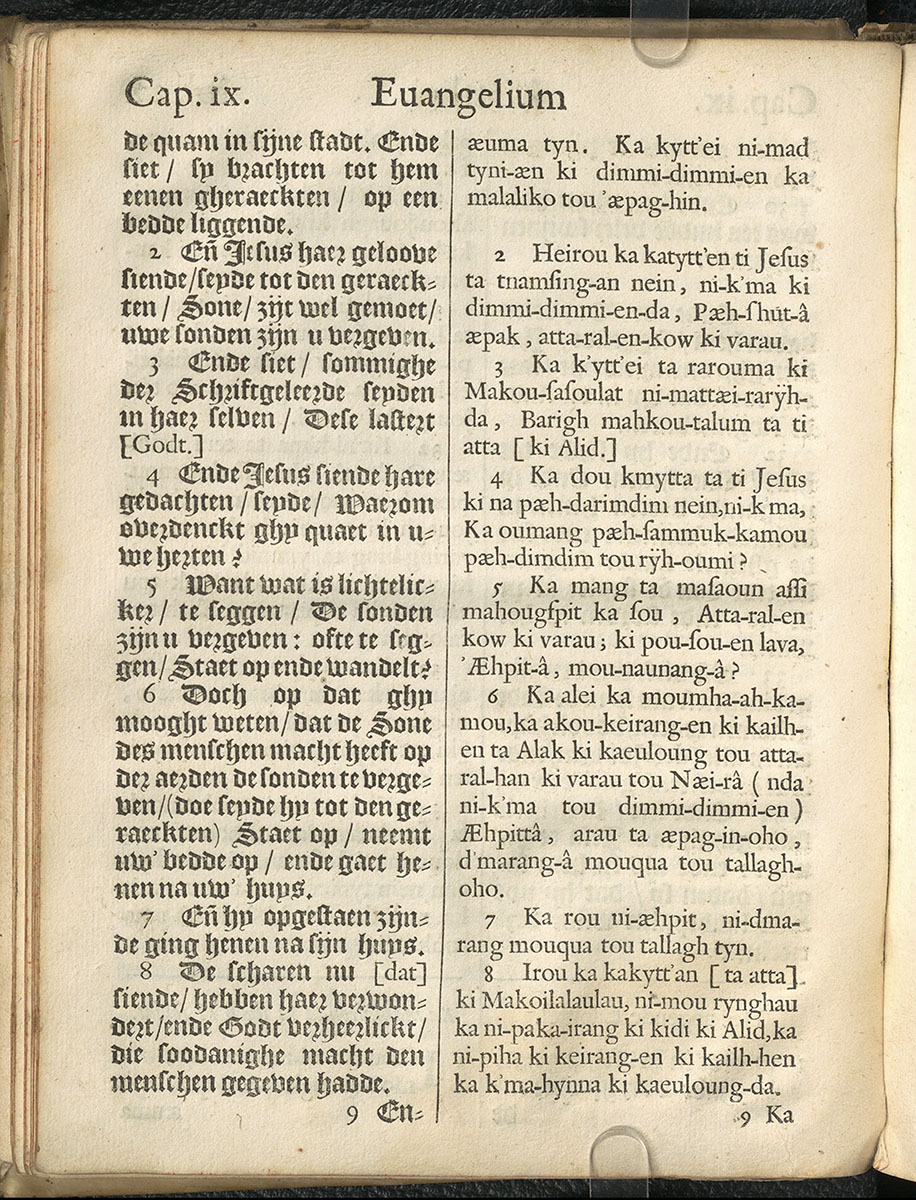 1661年新港譯本馬太福音和約翰福音(丹麥皇家圖書館) 馬太福音 9 章 2 節到 9 章 8 節