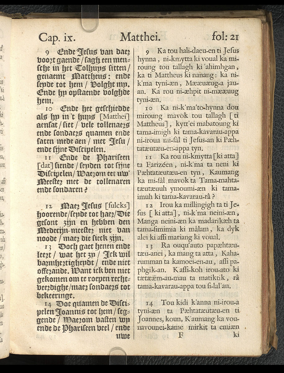 1661年新港譯本馬太福音和約翰福音(丹麥皇家圖書館) 馬太福音 9 章 9 節到 9 章 14 節