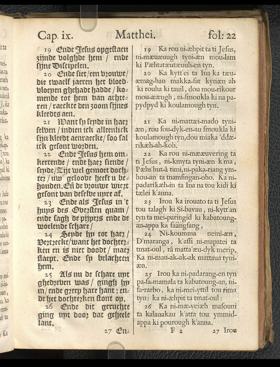 1661年新港譯本馬太福音和約翰福音(丹麥皇家圖書館) 馬太福音 9 章 19 節到 9 章 26 節
