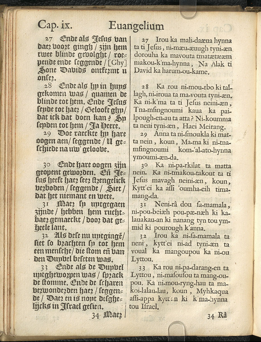 1661年新港譯本馬太福音和約翰福音(丹麥皇家圖書館) 馬太福音 9 章 27 節到 9 章 33 節