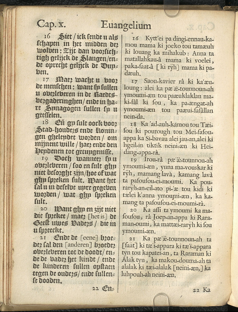 1661年新港譯本馬太福音和約翰福音(丹麥皇家圖書館) 馬太福音 10 章 16 節到 10 章 21 節