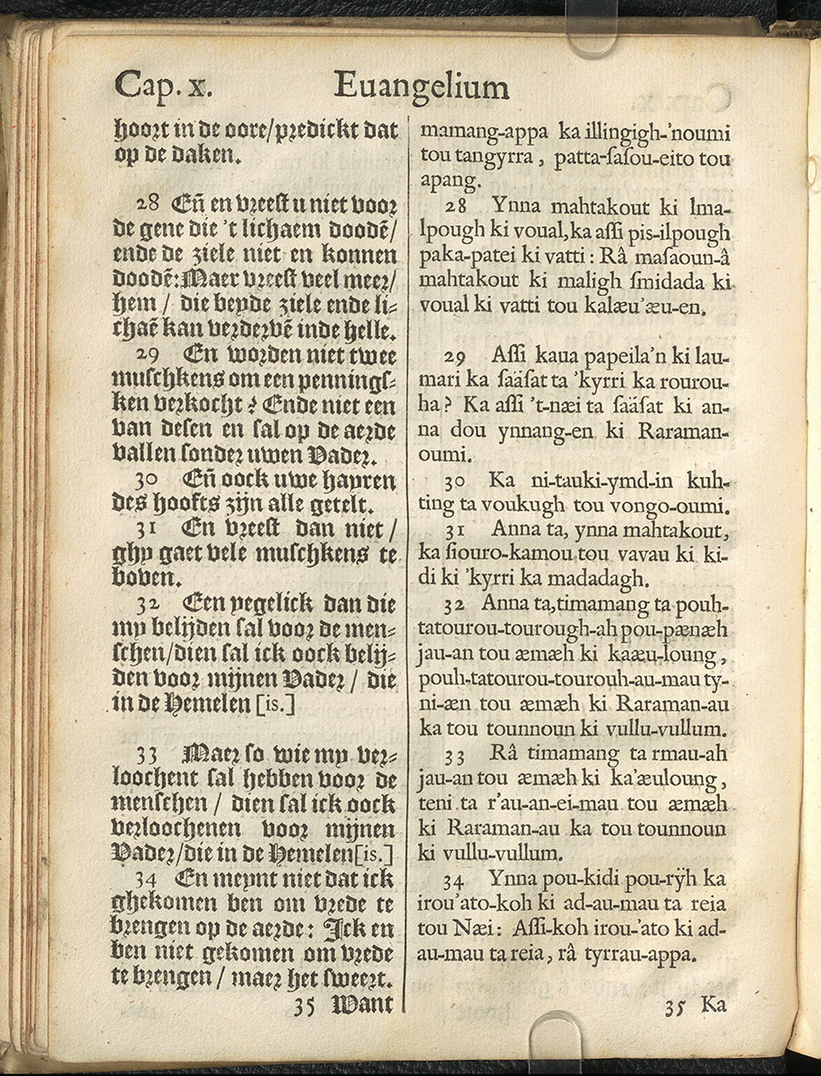 1661年新港譯本馬太福音和約翰福音(丹麥皇家圖書館) 馬太福音 10 章 28 節到 10 章 34 節