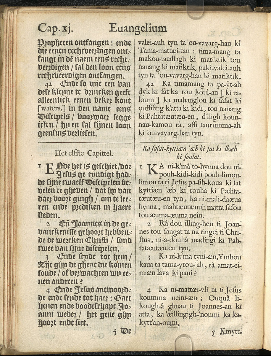 1661年新港譯本馬太福音和約翰福音(丹麥皇家圖書館) 馬太福音 10 章 42 節到 11 章 4 節
