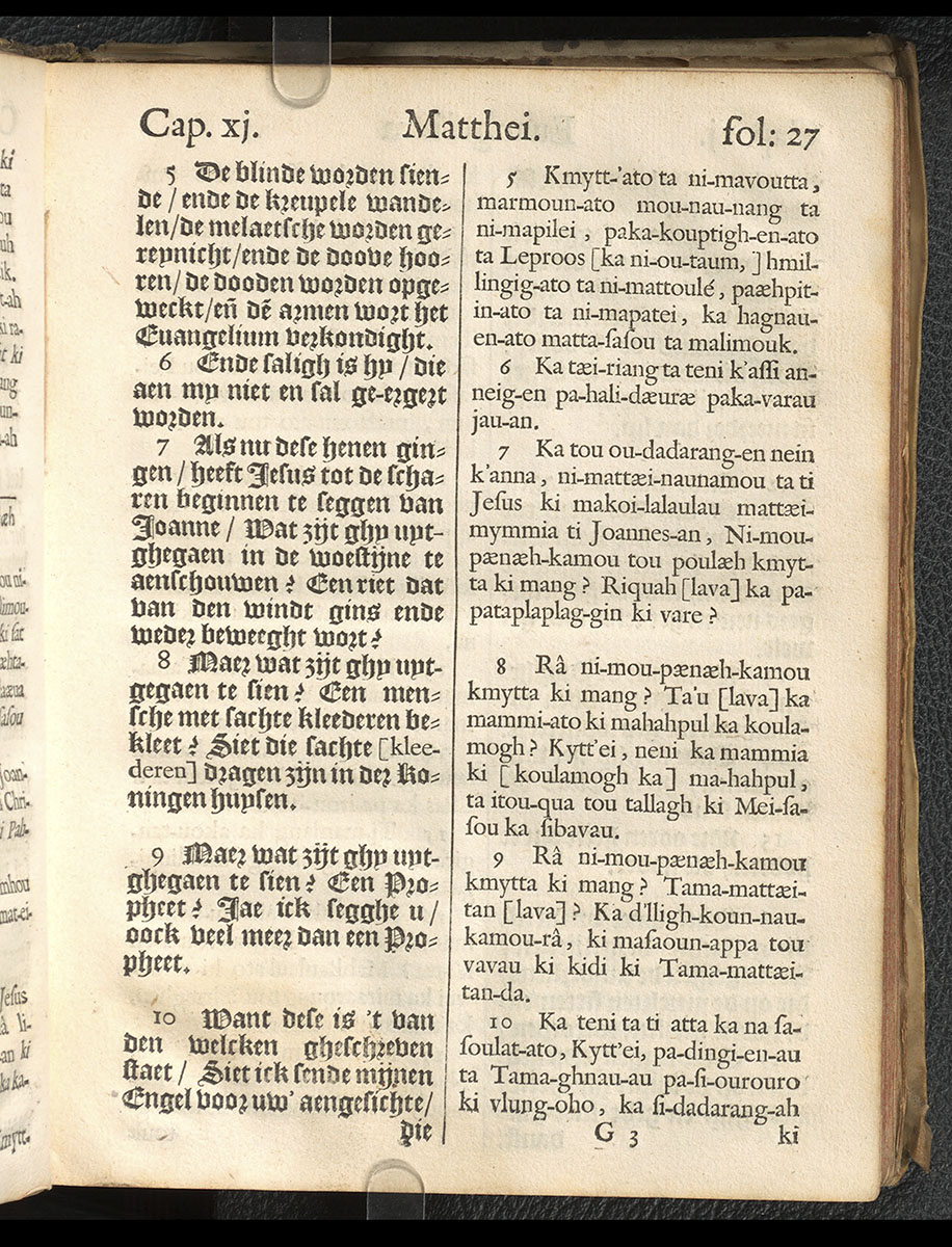 1661年新港譯本馬太福音和約翰福音(丹麥皇家圖書館) 馬太福音 11 章 5 節到 11 章 10 節