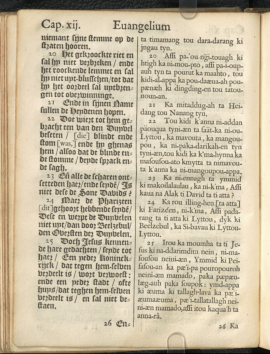1661年新港譯本馬太福音和約翰福音(丹麥皇家圖書館) 馬太福音 12 章 20 節到 12 章 25 節