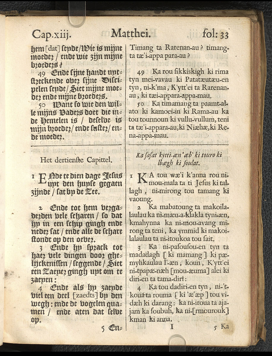 1661年新港譯本馬太福音和約翰福音(丹麥皇家圖書館) 馬太福音 12 章 49 節到 13 章 4 節