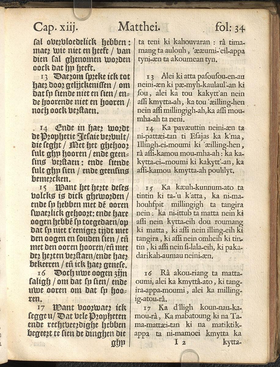 1661年新港譯本馬太福音和約翰福音(丹麥皇家圖書館) 馬太福音 13 章 13 節到 13 章 17 節