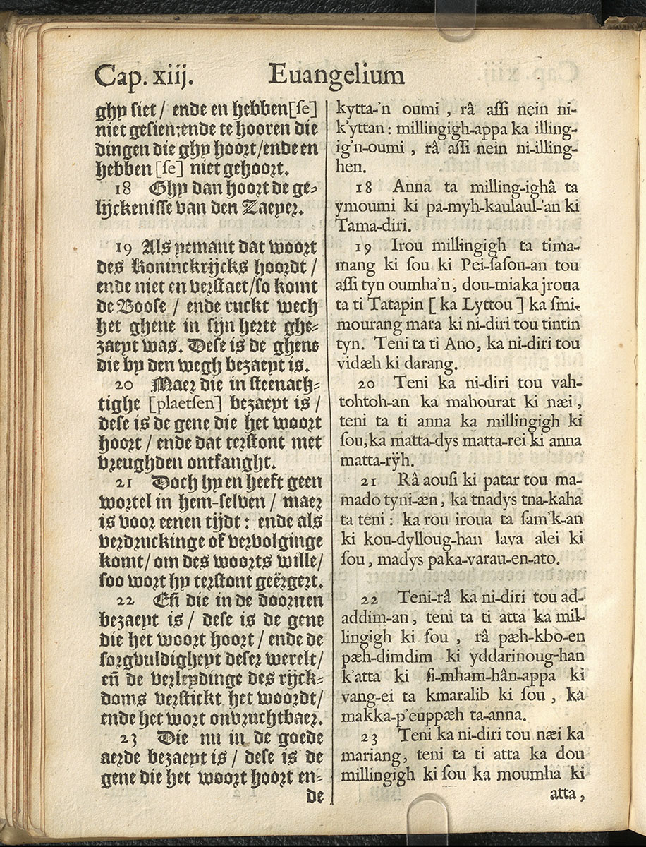 1661年新港譯本馬太福音和約翰福音(丹麥皇家圖書館) 馬太福音 13 章 18 節到 13 章 23 節