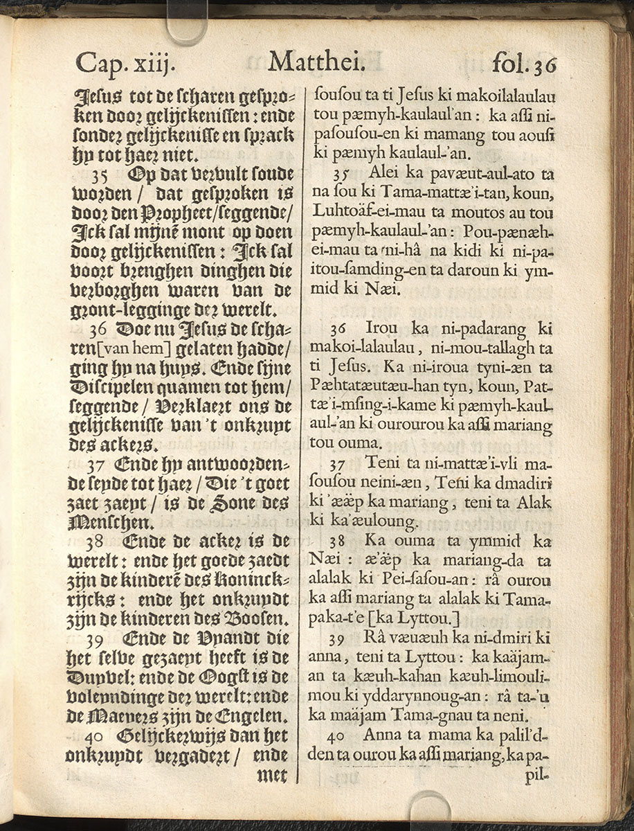 1661年新港譯本馬太福音和約翰福音(丹麥皇家圖書館) 馬太福音 13 章 35 節到 13 章 40 節