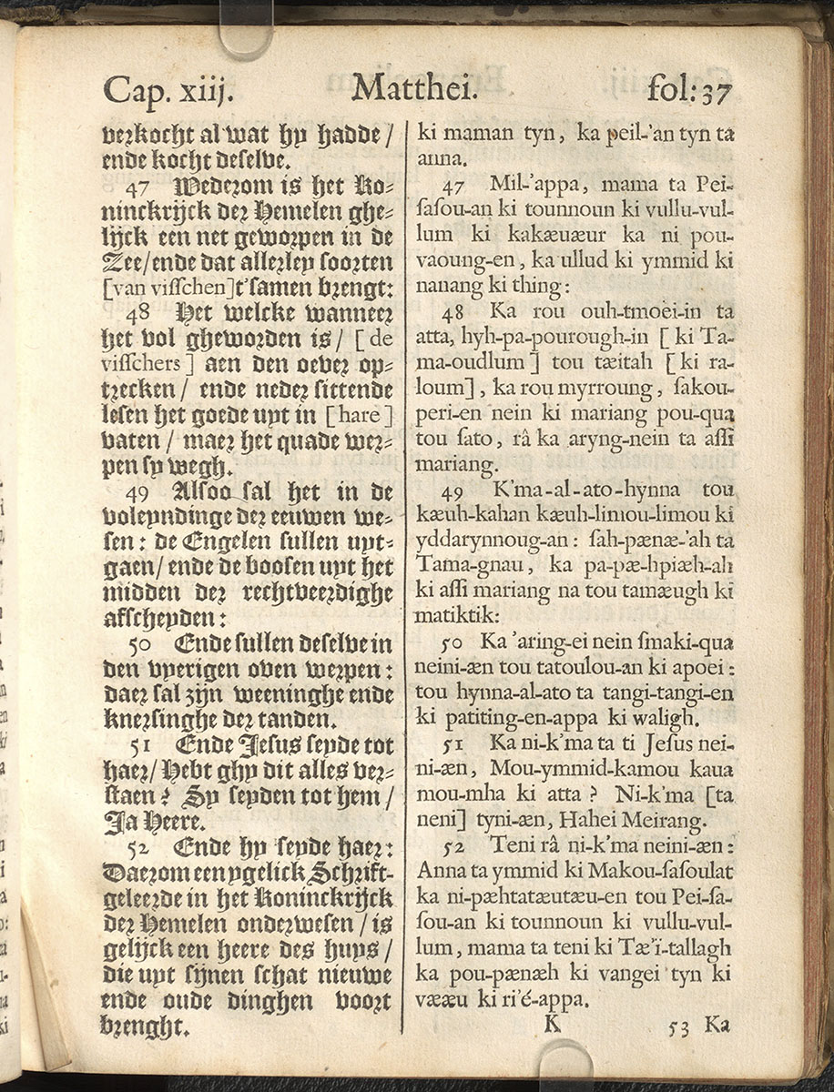 1661年新港譯本馬太福音和約翰福音(丹麥皇家圖書館) 馬太福音 13 章 47 節到 13 章 52 節