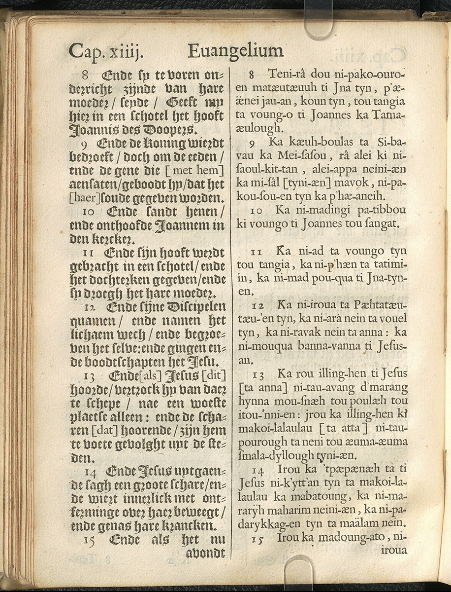 1661年新港譯本馬太福音和約翰福音(丹麥皇家圖書館) 馬太福音 14 章 8 節到 14 章 15 節