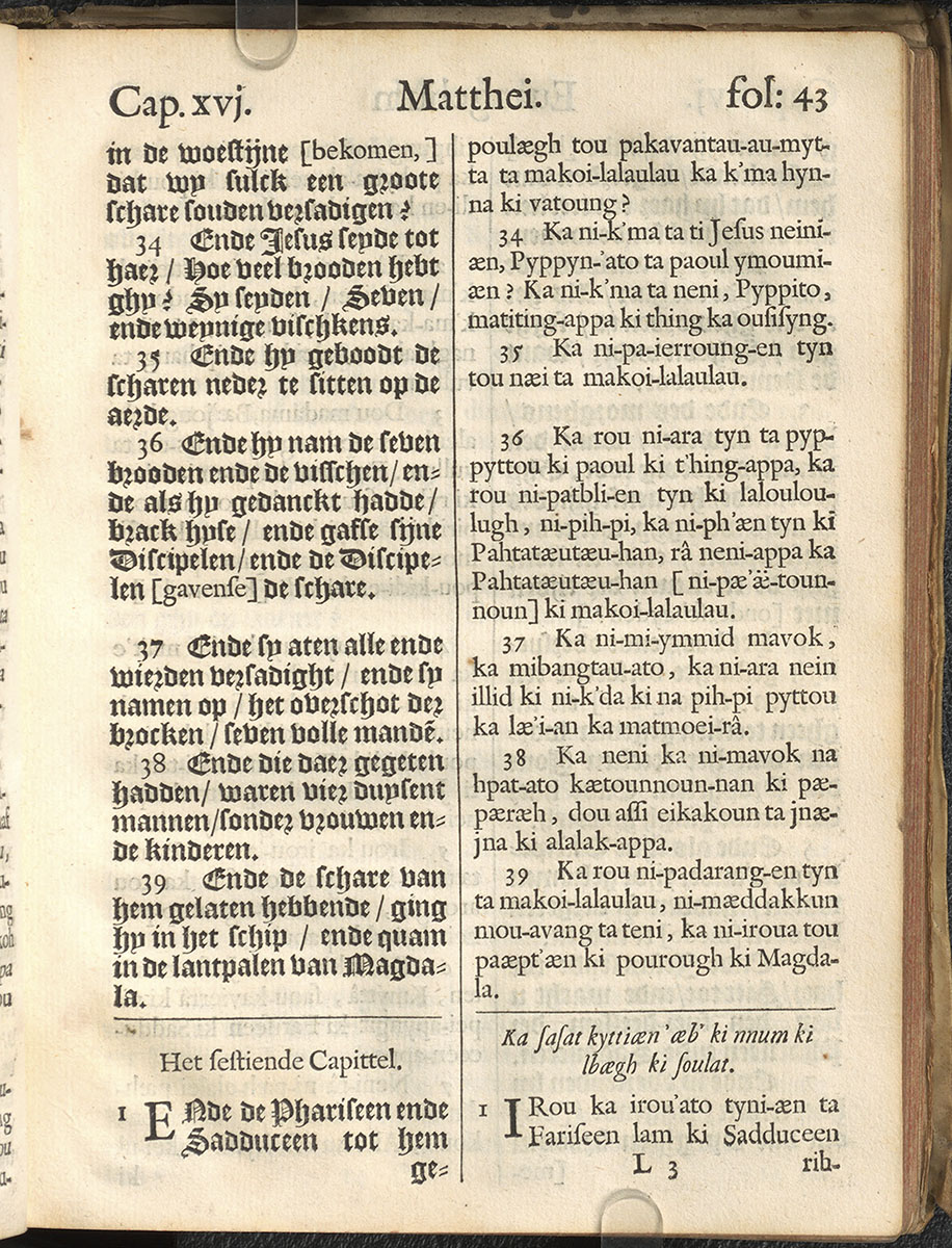 1661年新港譯本馬太福音和約翰福音(丹麥皇家圖書館) 馬太福音 15 章 34 節到 16 章 1 節