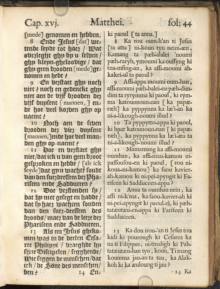 1661年新港譯本馬太福音和約翰福音(丹麥皇家圖書館) 馬太福音 16 章 8 節到 16 章 13 節