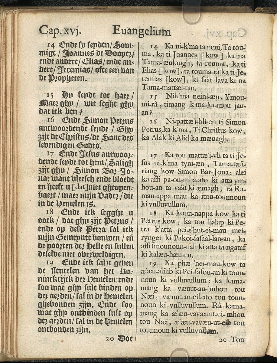1661年新港譯本馬太福音和約翰福音(丹麥皇家圖書館) 馬太福音 16 章 14 節到 16 章 19 節
