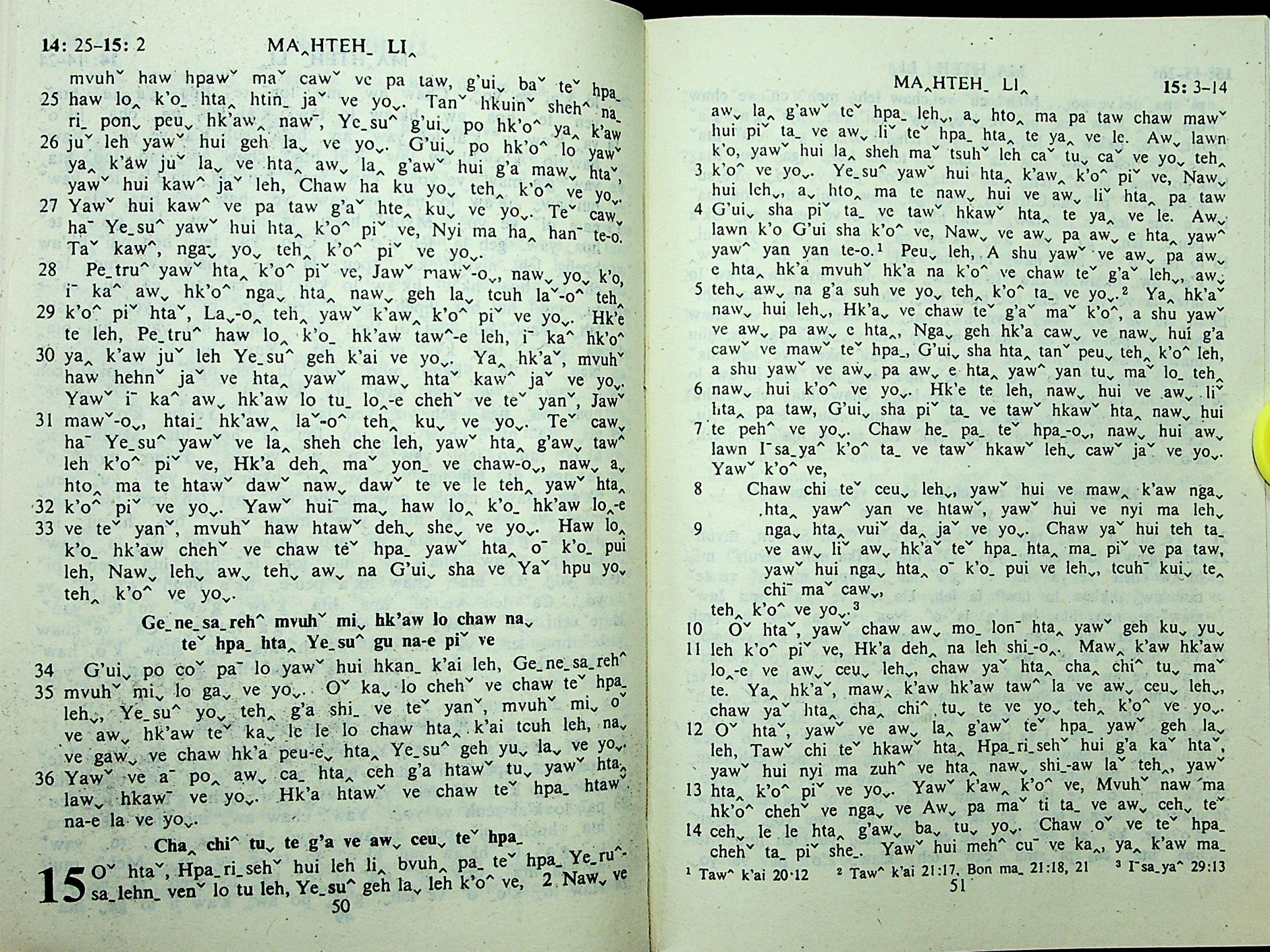1985年拉祜文新約全書 馬太福音 14 章 25 節到 15 章 14 節