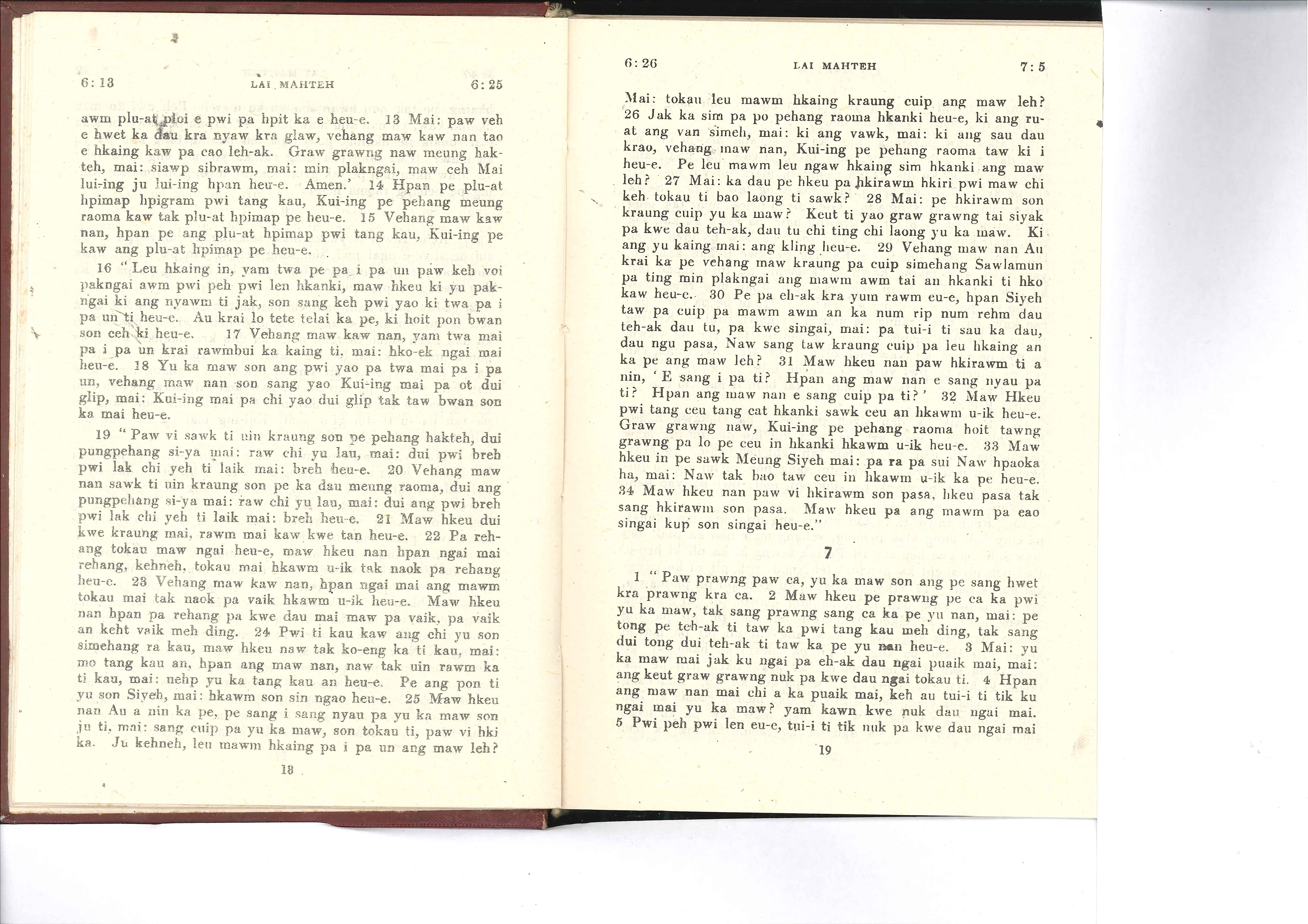 1985年佤文新約全書 馬太福音 6 章 13 節到 7 章 5 節
