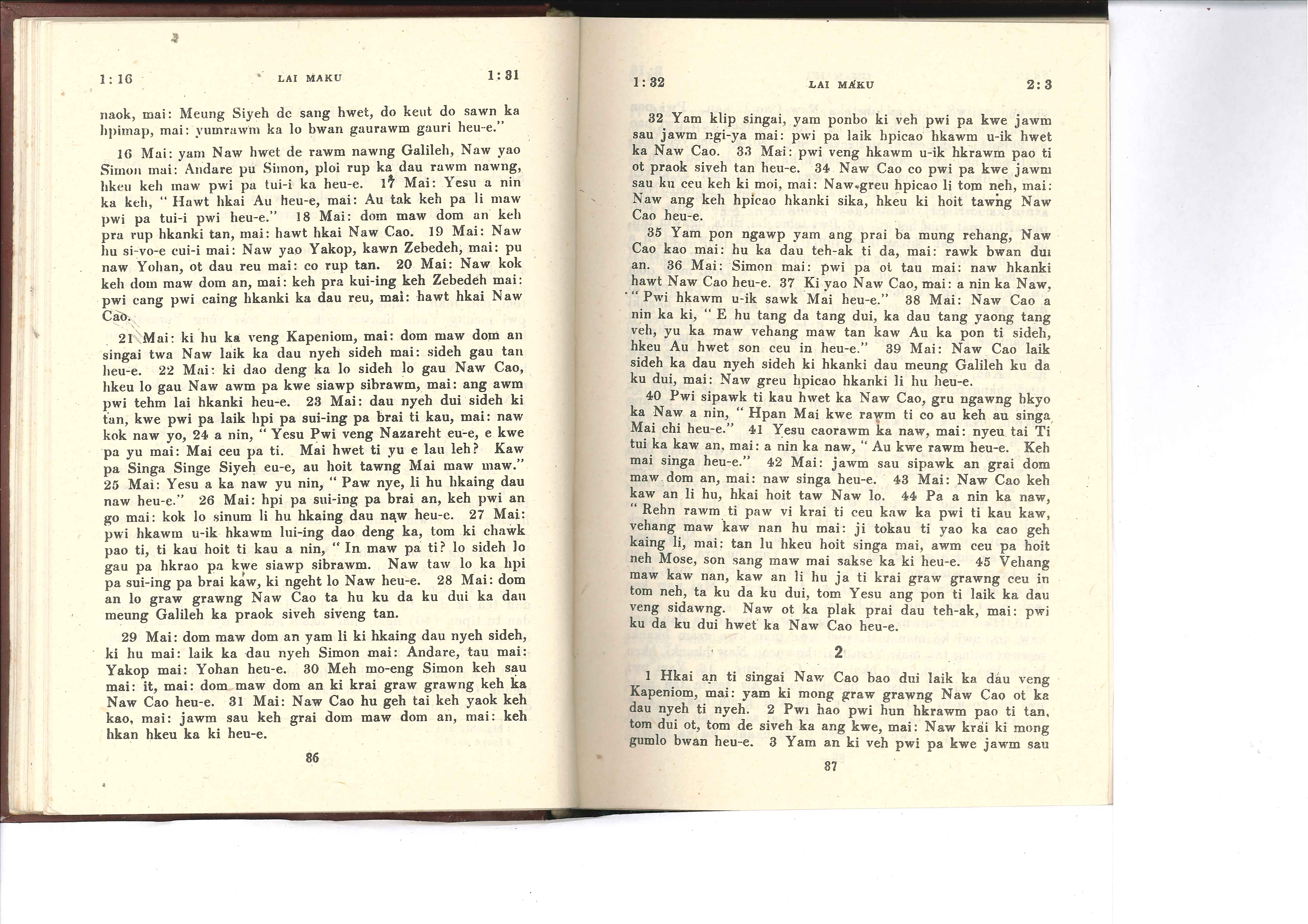 1985年佤文新約全書 馬可福音 1 章 16 節到 2 章 3 節