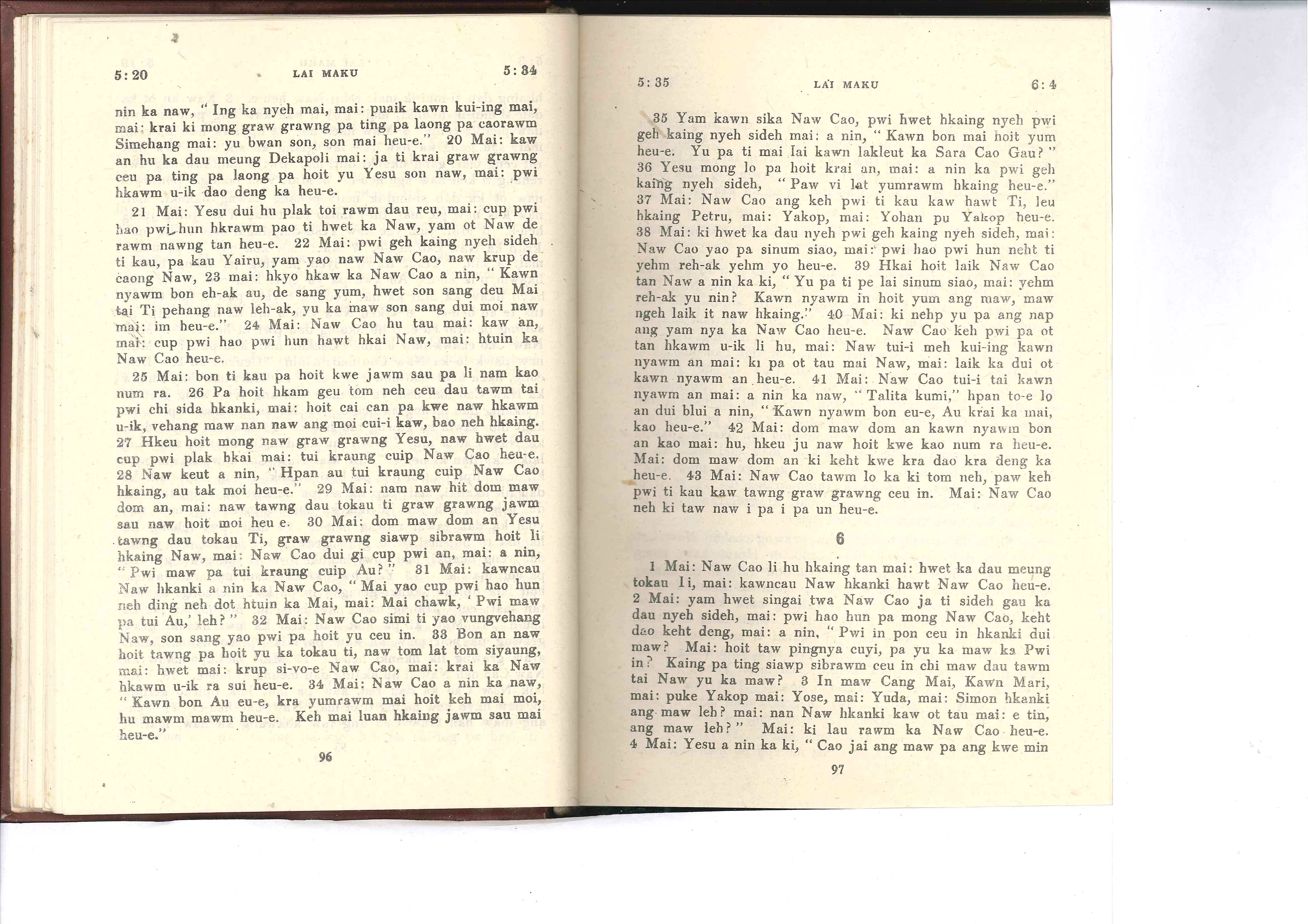 1985年佤文新約全書 馬可福音 5 章 20 節到 6 章 4 節