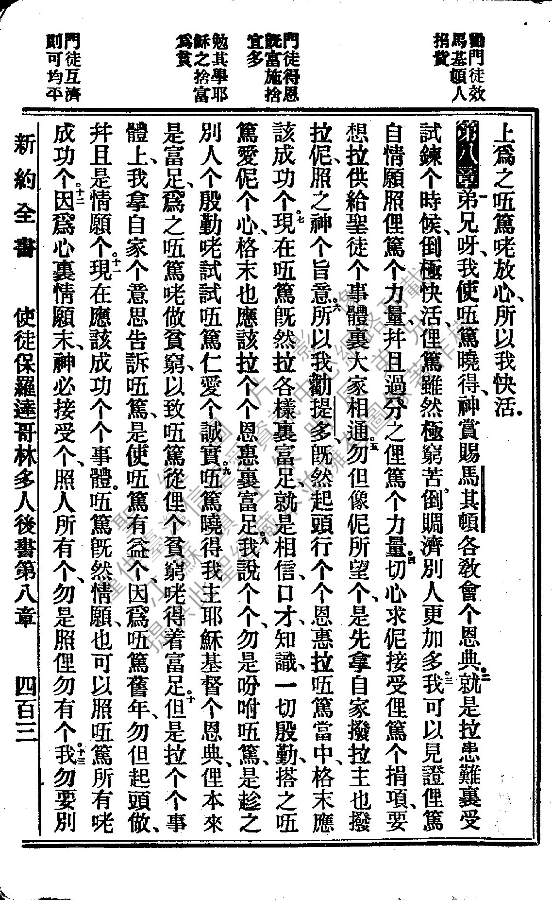 1922年新約全書 哥林多後書 8 章 1 節到 8 章 13 節