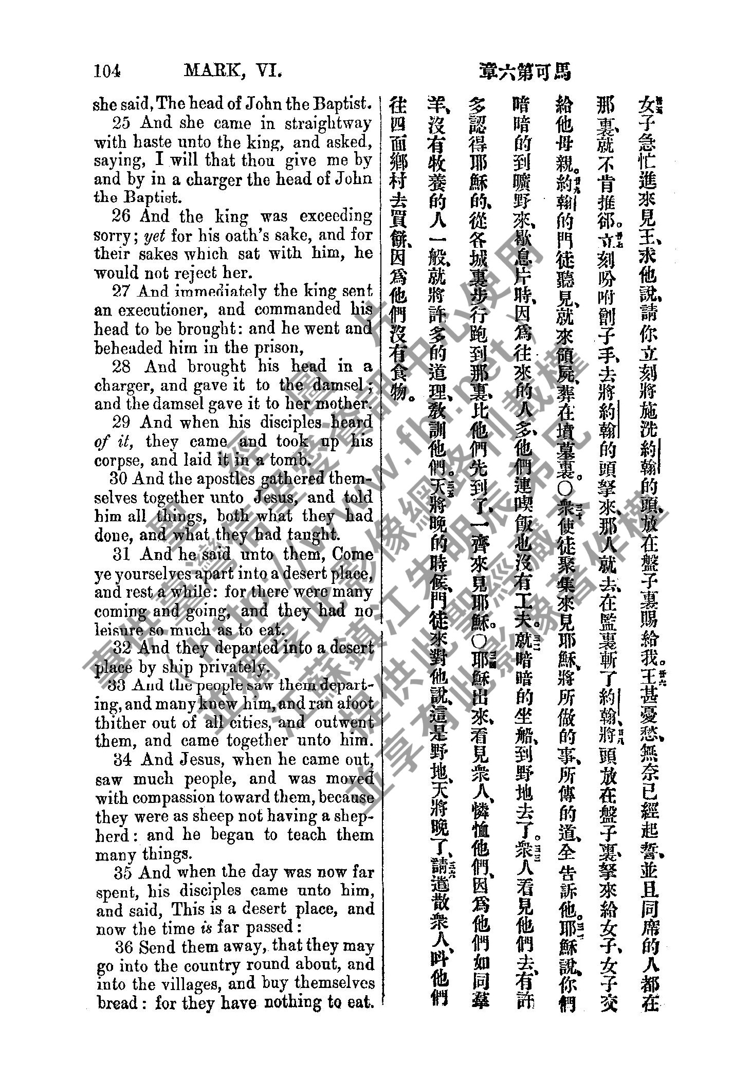 1885年新約全書 馬可福音 6 章 25 節到 6 章 36 節