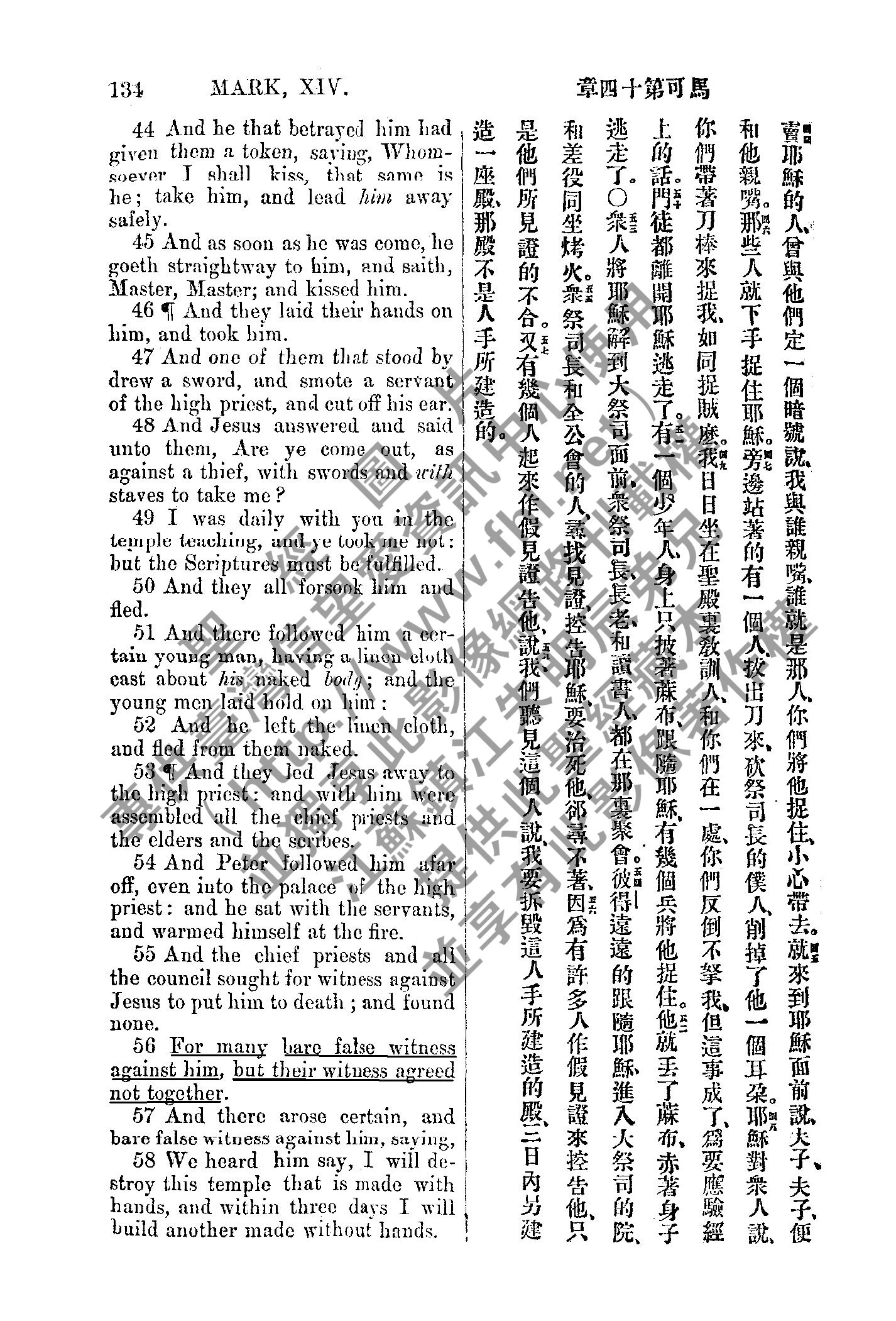 1885年新約全書 馬可福音 14 章 44 節到 14 章 58 節