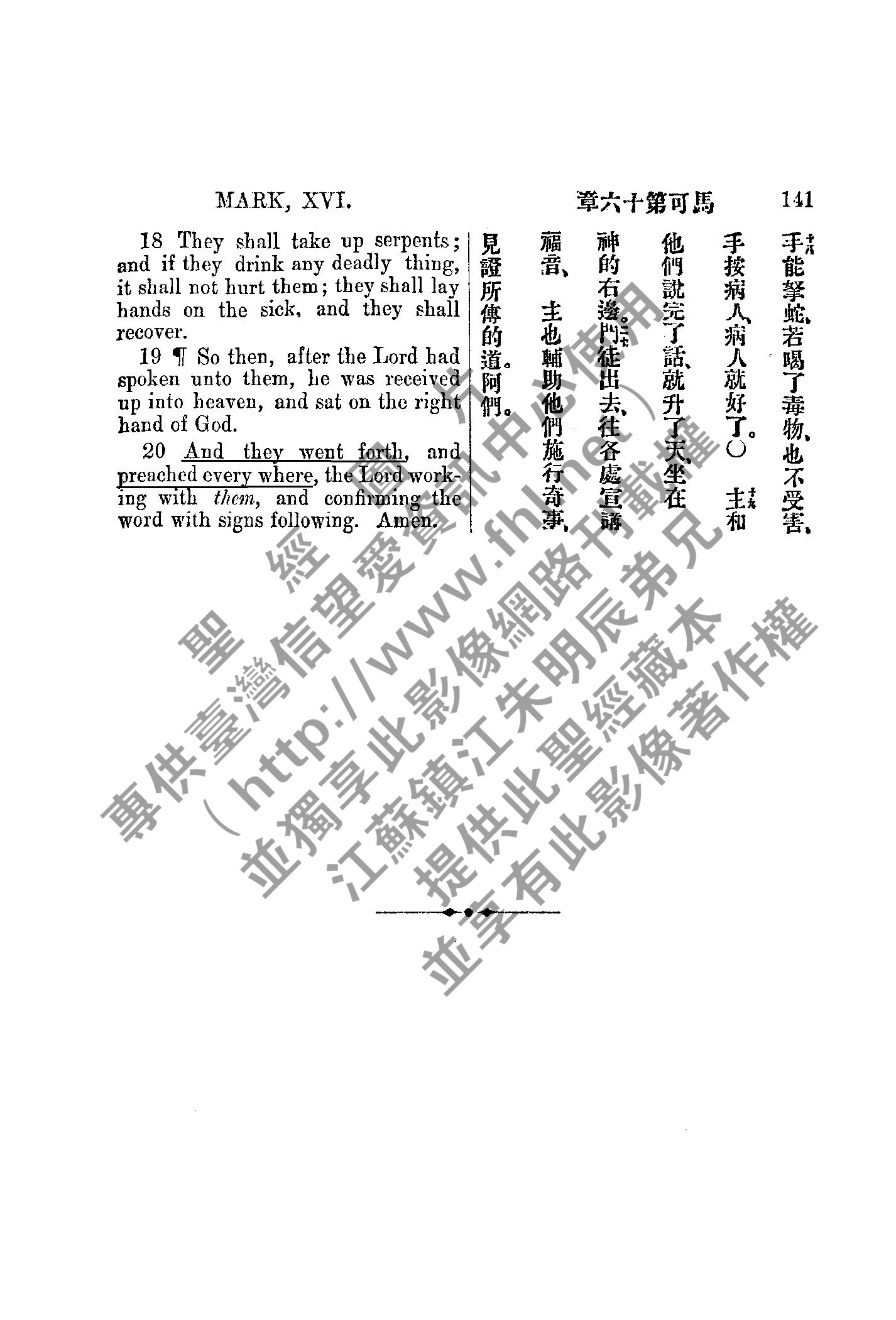 1885年新約全書 馬可福音 16 章 18 節到 16 章 20 節