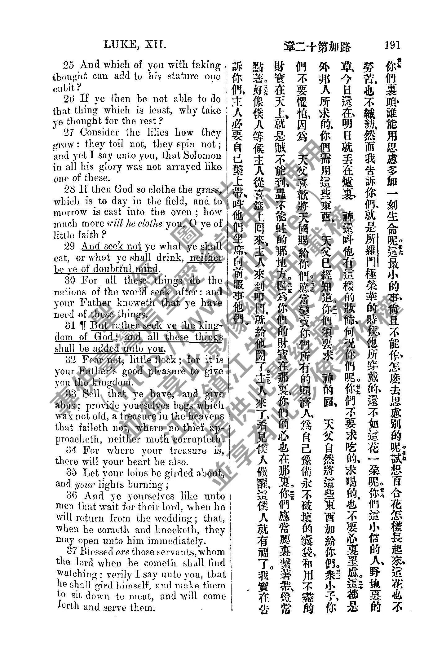 1885年新約全書 路加福音 12 章 25 節到 12 章 37 節