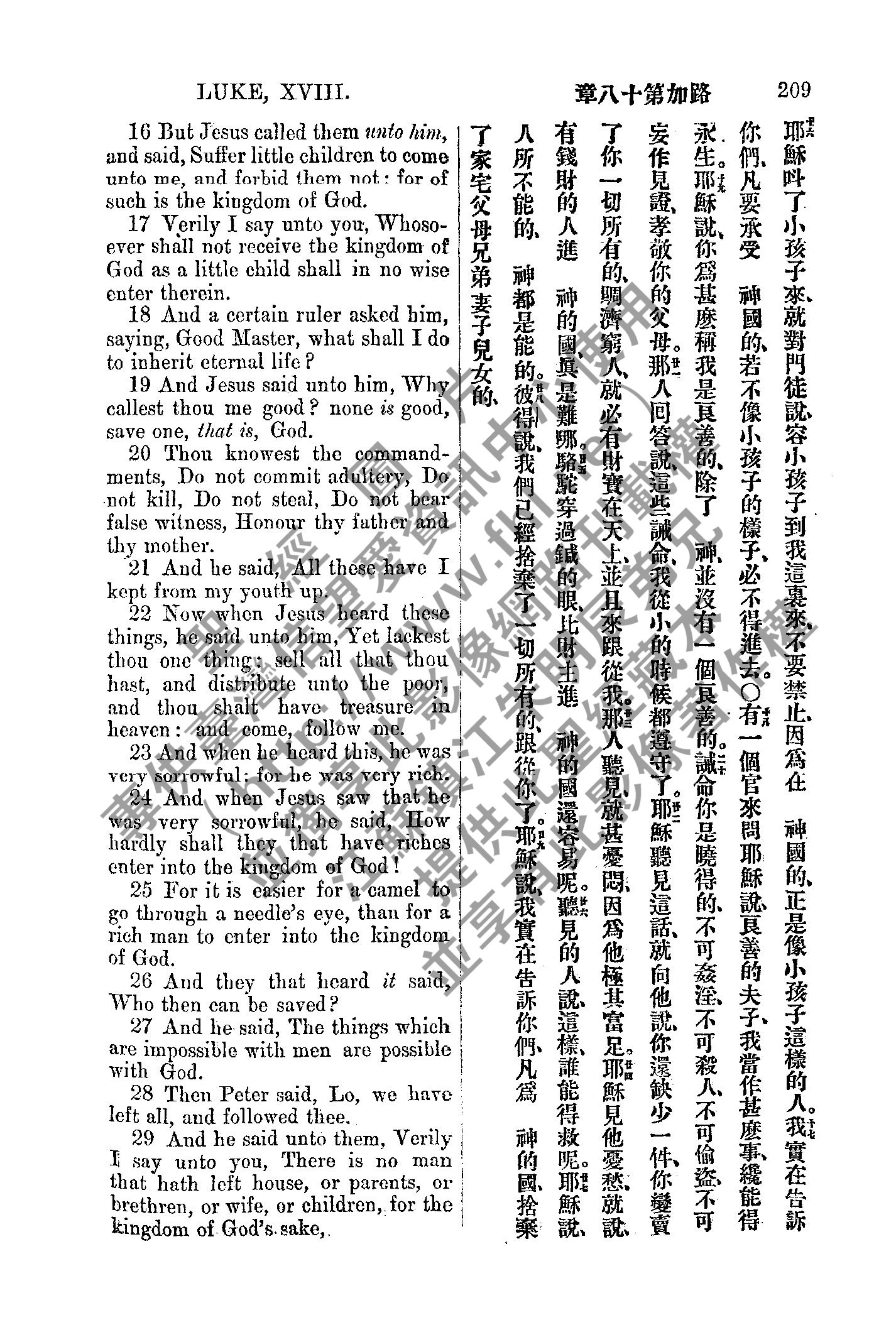 1885年新約全書 路加福音 18 章 16 節到 18 章 29 節