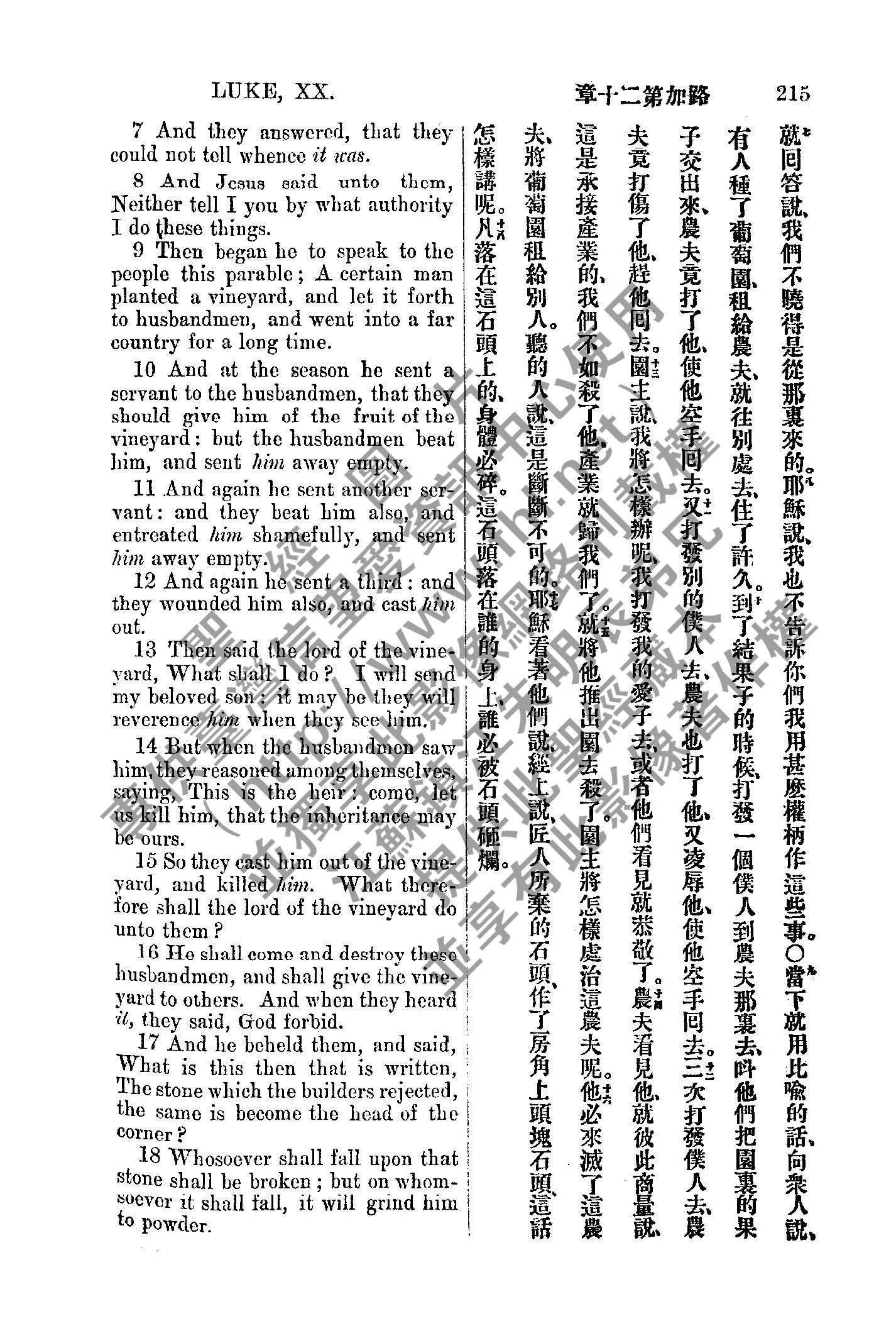 1885年新約全書 路加福音 20 章 7 節到 20 章 18 節